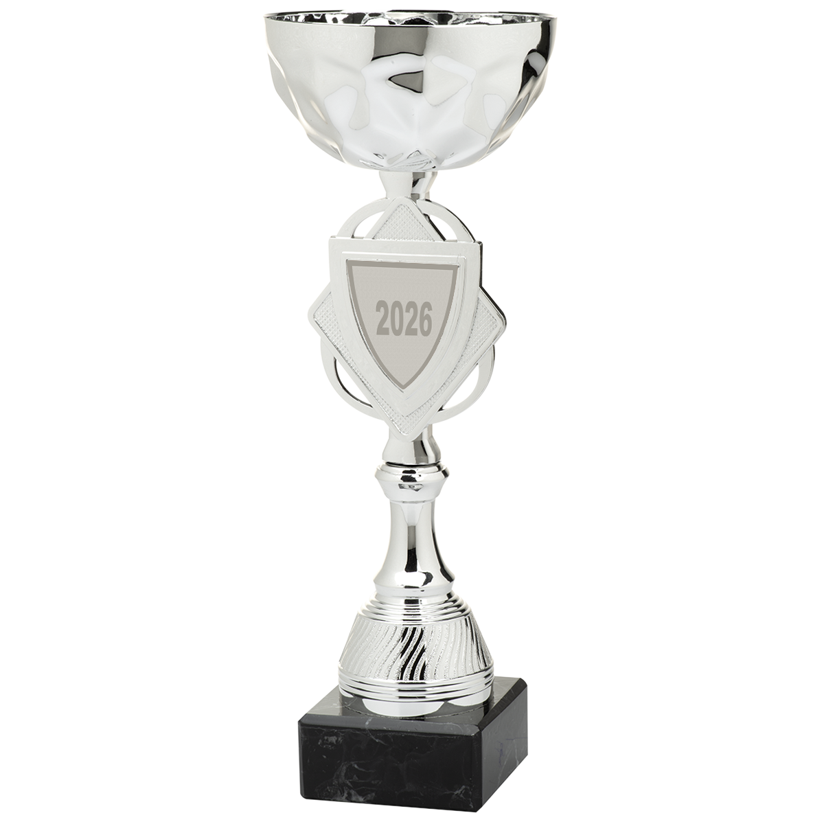 Deze prachtige zilverenkleurige trofee met een zwarte marmer voet is de perfecte manier om prestaties te vieren. Gemaakt van een hoogwaardige metalen cup en een duurzaam kunststof tussenstuk, biedt deze trofee niet alleen een luxe uitstraling, maar ook een lange levensduur. U kunt kiezen uit diverse afbeeldingen voor het schildje, waardoor u de trofee volledig kunt personaliseren. Voeg uw eigen tekst toe om het een unieke touch te geven, ideaal voor sportevenementen, bedrijfsprijzen of speciale gelegenheden. Maak uw erkenning onvergetelijk met deze schitterende trofee!