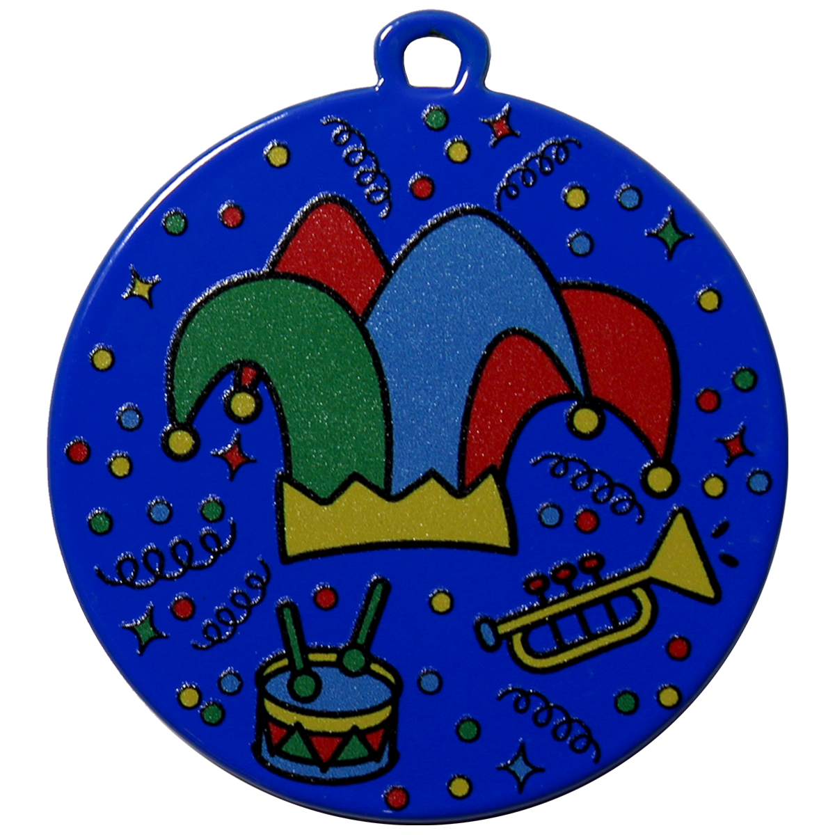 De medaille is voorzien van een kleurrijk narrenontwerp met confetti, trom en trompet – een echt symbool van feest en plezier.