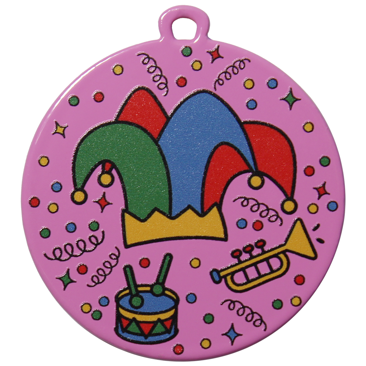 De medaille is voorzien van een kleurrijk narrenontwerp met confetti, trom en trompet – een echt symbool van feest en plezier.