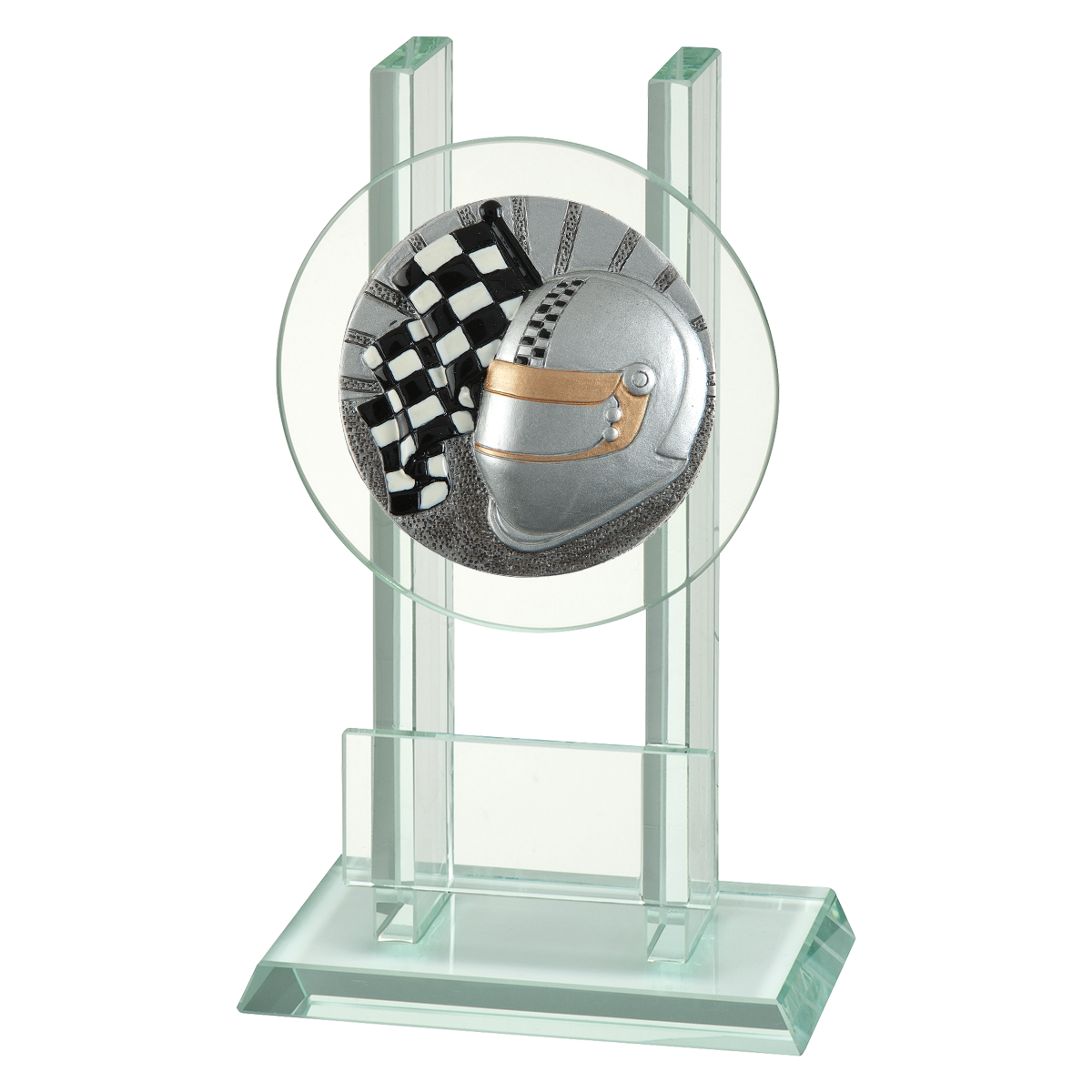 Deze prachtige glazen trofee met een gouden en zilveren afwerking is de perfecte beloning voor elke autosport liefhebber. De ronde schijf toont een gedetailleerde afbeelding van een racehelm en finishvlag, waardoor het een opvallend stuk is voor elke prijsuitreiking. Bovendien kunt u deze trofee personaliseren met een graveerplaatje, zodat u uw eigen persoonlijke tekst kunt toevoegen.