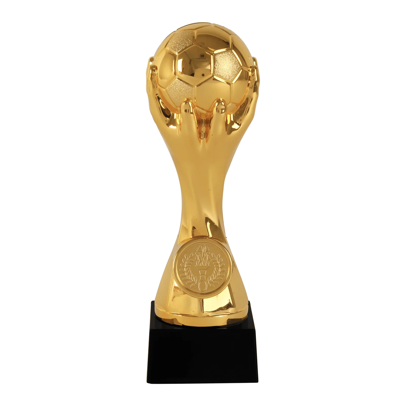 Deze gouden BUDGET voetbal trofee is dé perfecte prijs voor kampioenen en winnaars van voetbaltoernooien. Het unieke ontwerp met een voetbal gedragen door handen symboliseert kracht, prestatie en overwinning – ideaal voor elke prijsuitreiking.