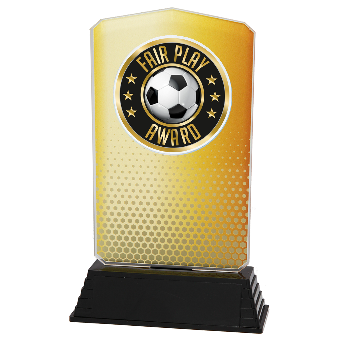 Deze Fair Play trofee van acryl is speciaal ontworpen om sportiviteit, respect en fair play te belonen. Het moderne ontwerp met “Fair Play Award”-embleem en voetbal straalt waardering en positieve sportwaarden uit. De trofee staat stevig op een zwarte kunststof voet, die ruimte biedt voor een persoonlijk tekstplaatje.