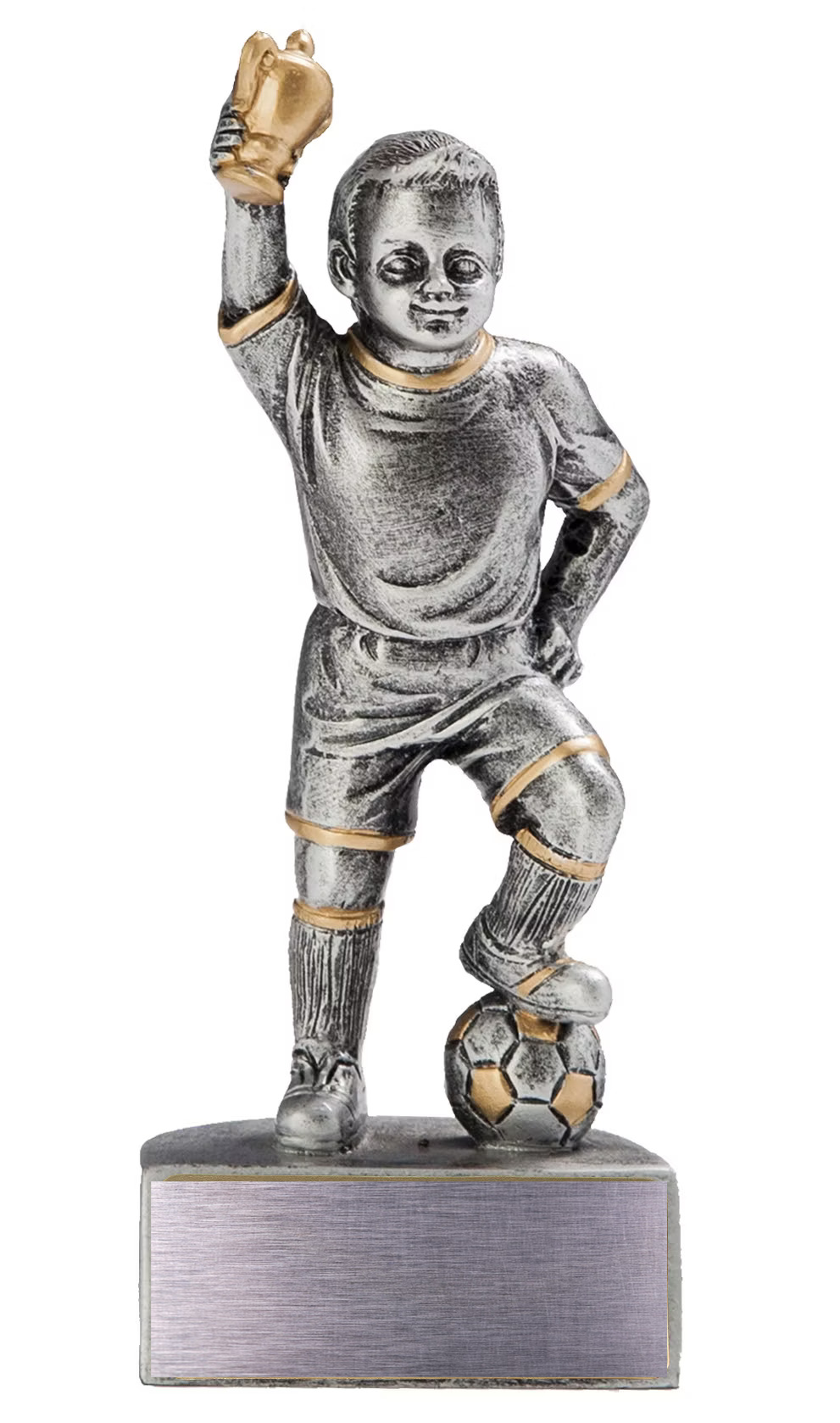 Deze prachtige voetbal trofee is vervaardigd uit resin. De trofee toont een voetballer die trots een trofee in de hand houdt, met een bal onder zijn voet, wat de essentie van sportieve prestatie perfect vastlegt. Personaliseer deze trofee met uw eigen tekst en maak het een onvergetelijk aandenken voor de ware voetbal kampioen. Een perfect cadeau voor elke gelegenheid, dat zeker in de smaak zal vallen!